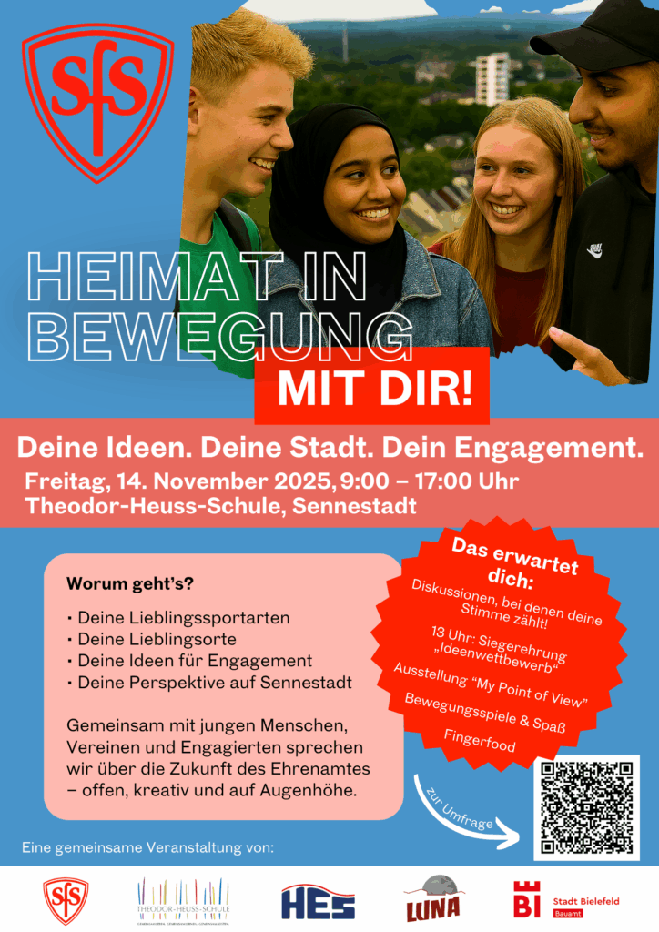 Unter dem Titel „Heimat in Bewegung – Zukunft gemeinsam gestalten“ veranstalten die Sportfreunde Sennestadt e. V. gemeinsam mit der Theodor-Heuss-Schule am Freitag, dem 14. November 2025, ein öffentliches Forum. Die Veranstaltung findet von 09:00 bis 17:00 Uhr in der Theodor-Heuss-Schule in Sennestadt statt.